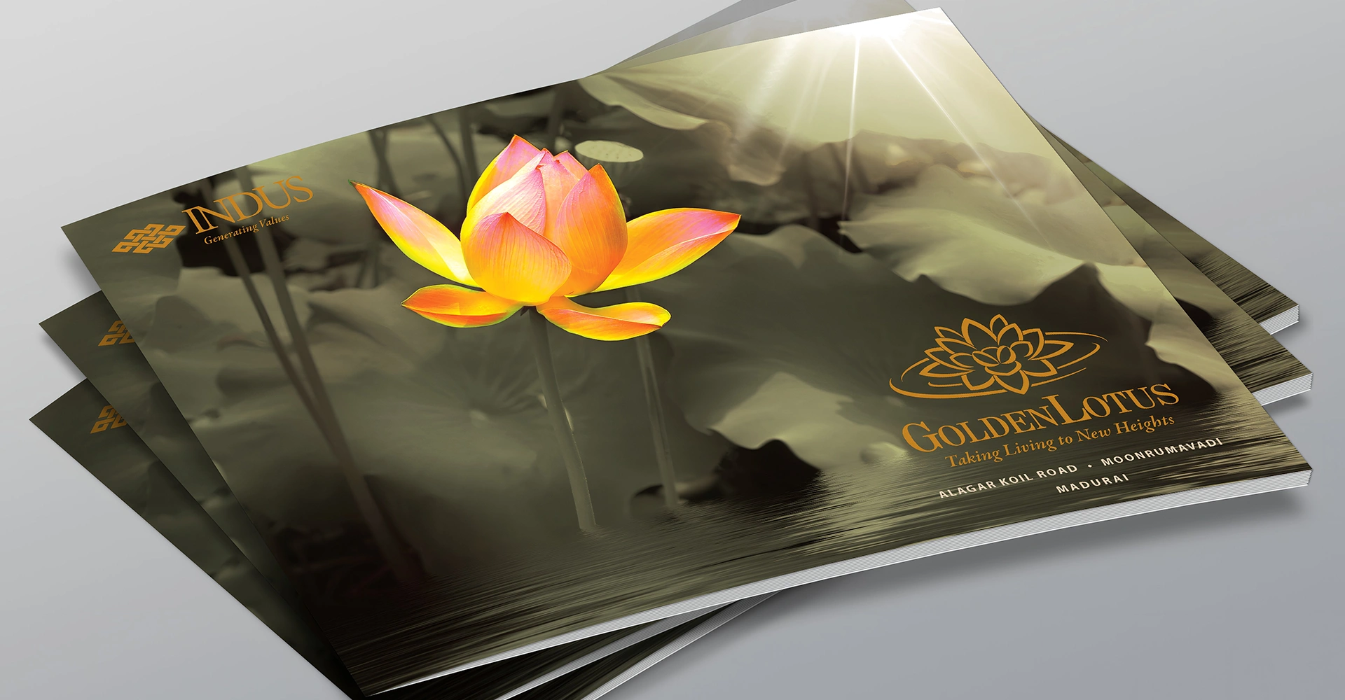 A brand identity was developed for a township in Madurai, a historic city known for its lotus-shaped urban plan. Inspired by this symbol, the graphic design received significant recognition and contributed to the project's success. The branding and positioning strategy included marketing collateral, immersive video walkthroughs, and regionally focused promotional events.